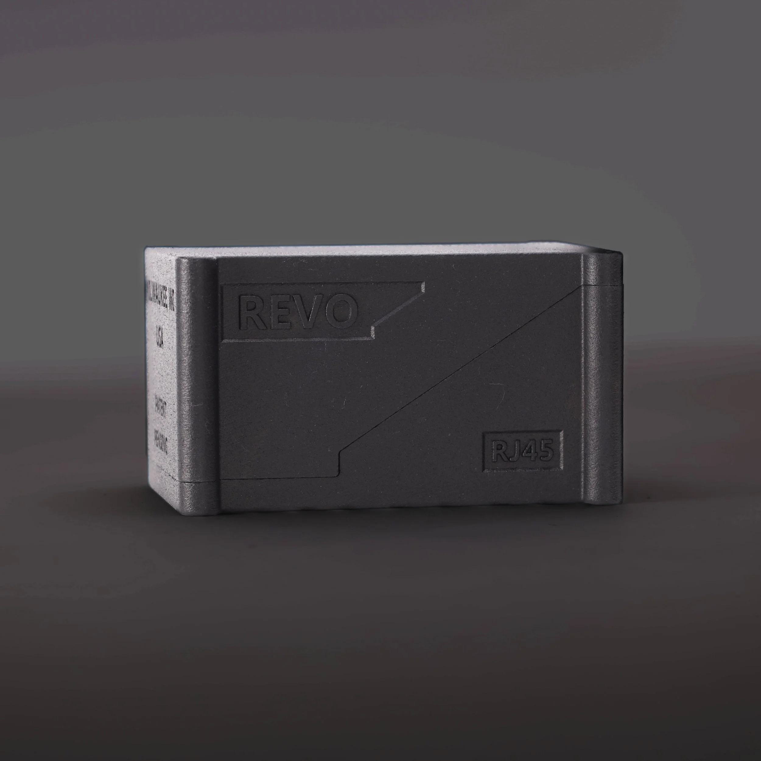 USB C and A Connections for power and data, RJ45 outs to Revo Devices.